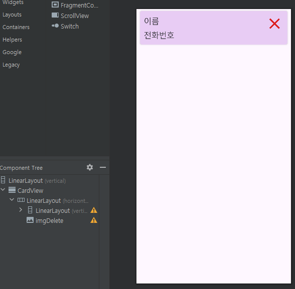 우선 하나의 행에 대한 화면개발을 먼저 한다. (파일명 contact_row, LinearLayout로 파일 생성)