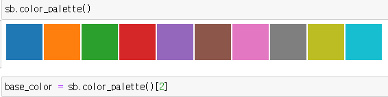 color = sb.color_palette()로 색을 보고 지정해서 넣는다. (지정해주지 않으면 알록달록한 차트가 생성)