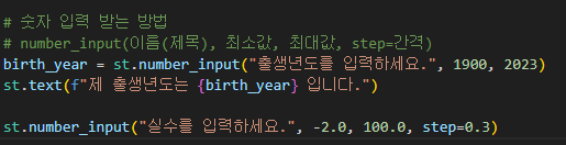 | [Python] Streamlit 위젯(UI) 만들고 사용하는 button(), radio(), checkbox(), selectbox(), multiselect(), slider(), expander() (0) | 2023.11.20 |