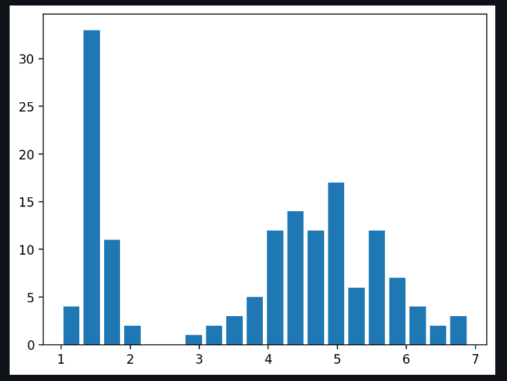 plt.hist(data=df, x="petal_length" , rwidth=0.8, bins=20)