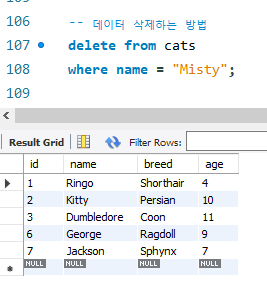 delete from 테이블명 where 컬럼 = 해당 데이터값