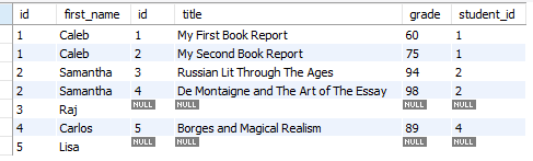 -> left join은 왼쪽 테이블(students)의 모든 행을 유지하면서 오른쪽 테이블(papers)과의 일치 여부에 따라 NULL 값을 가질수도 있는 경우에, NULL값을 가진 행도 같이 반환한다.