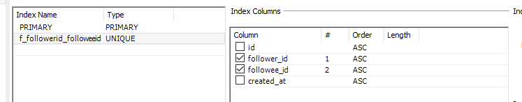 -> Index Name엔 자유롭게 작명, Type엔 unique로 설정 후 오른쪽탭에서 unique처리 되어야 하는 컬럼을 체크한다.