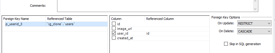 -> Foreign key Name(p_userid_3)을 정해주고 참조할 테이블(users)과 현재 테이블의 어떤 컬럼(user_id)을 외래키로 설정할건지, 또 참조할 테이블의 어떤 컬럼(id)을 참조할건지 선택해주고 우측에 보이는 Foreign Key Options에 On Delete 값을 CASCADE로 바꿔주고 Apply로 설정완료 한다.